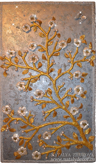 Материалы: золотая поталь, перламутровая эмаль, стразы хрустальные, мраморная крошка.
