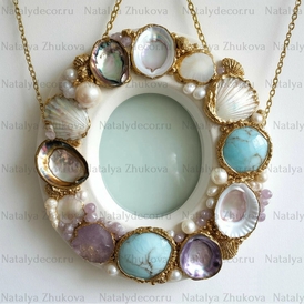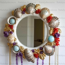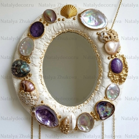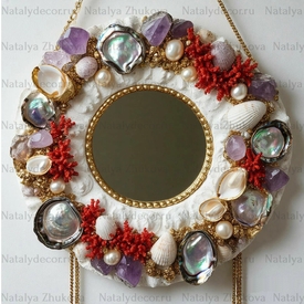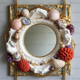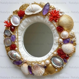 Основа зеркал – ХДФ; Отделка: самоцветы и морские раковины и кораллы, речной жемчуг, поталь; Покрытие – влагостойкий яхтный лак.